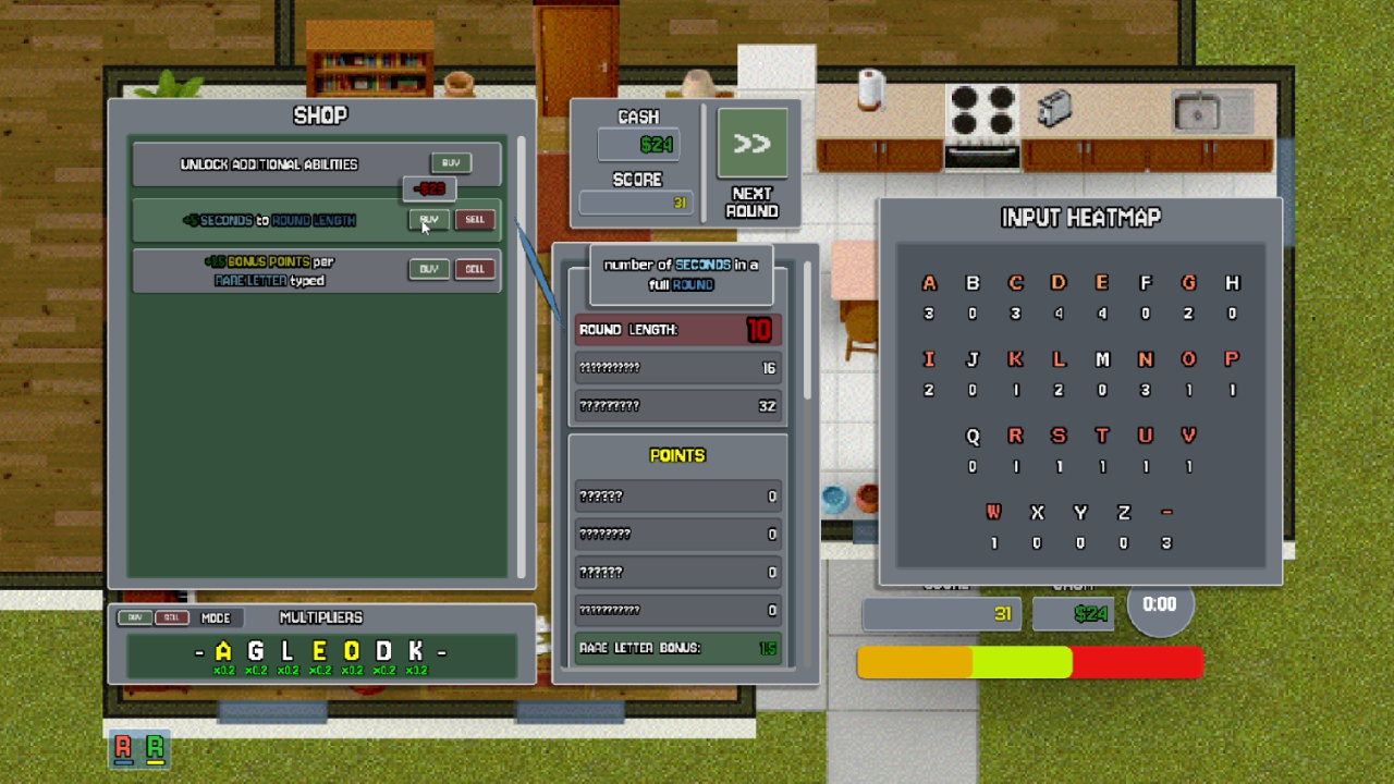 Survive timed rounds by earning enough points, choose upgrades, visit the shop, and repeat until failure. The only goal is a high-score.